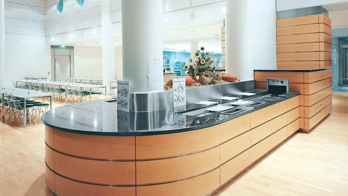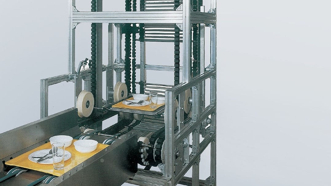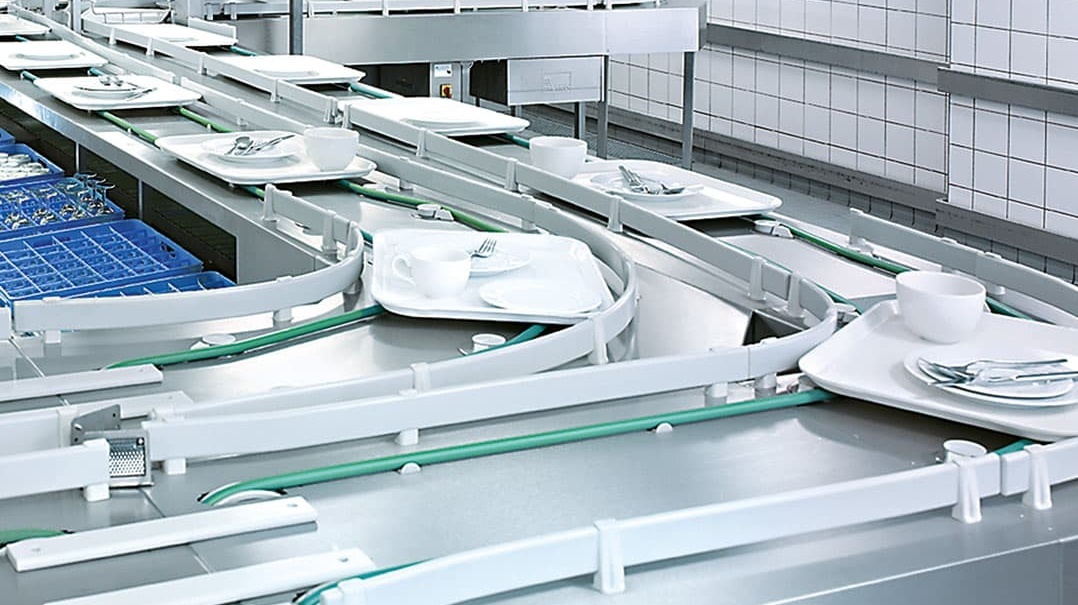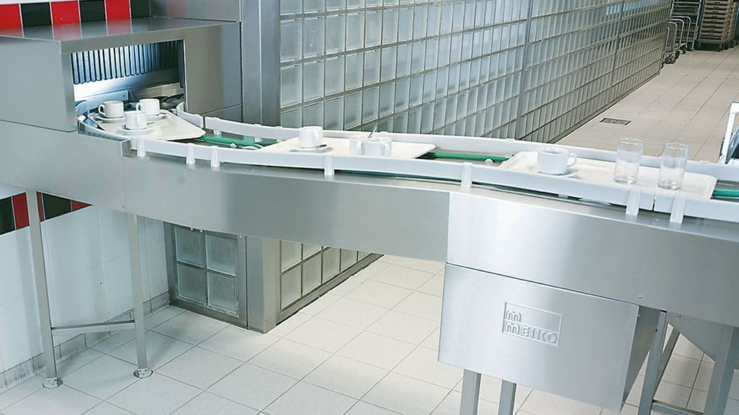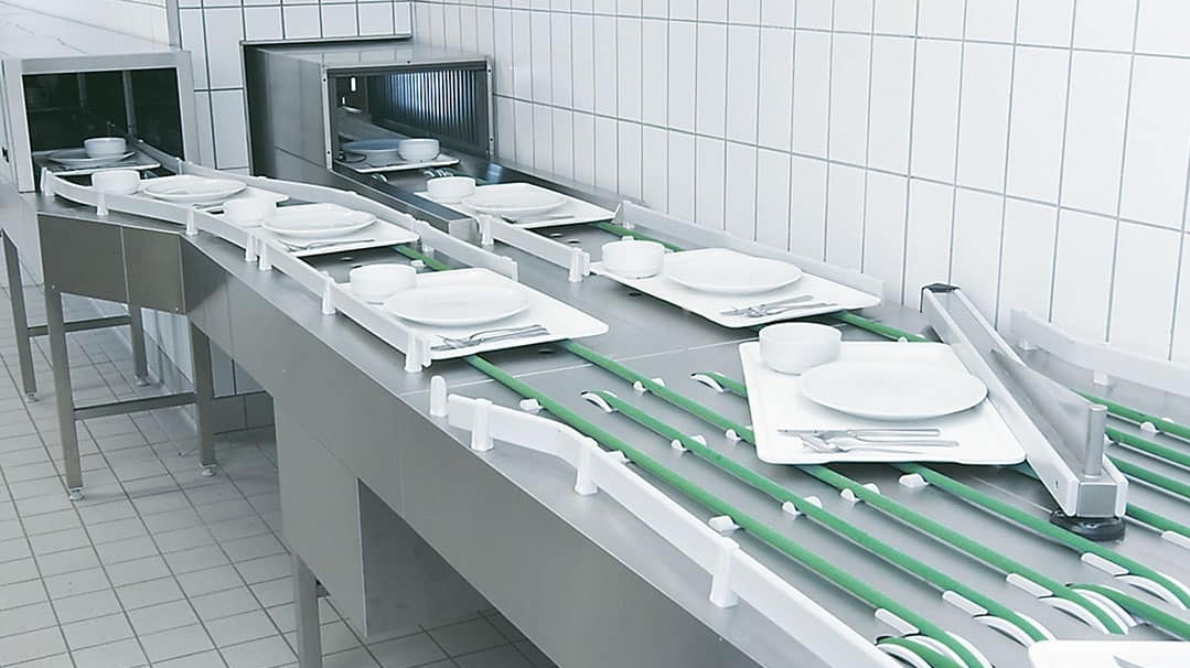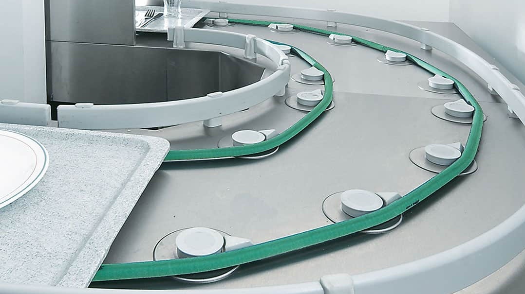 Unsere Fördertechnik übernimmt diese Aufgabe: keine Schwerstarbeit mehr, um prall gefüllte Geschirrwagen in andere Etagen zur Spülmaschine zu schieben. Der Gast gibt sein Tablett mit Schmutzgeschirr und Speiseresten direkt am Förderband auf. Kluge Konstruktionen schaffen werterhaltende Servicemöglichkeiten: Ist ein Rundriemen kaputt, wird er einzeln ausgetauscht und punktverschweißt, die Anlage läuft weiter...